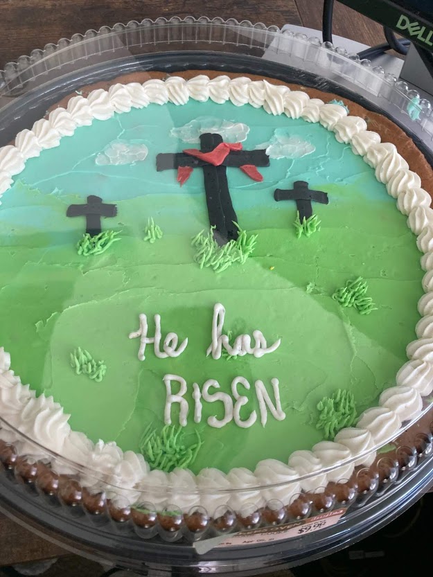 Not only were choices made to create and market this cookie cake, but some confusing artistic choices were made by the icing artist. Namely–why is a crucifixion scenescape so pastel and cheery? I know, I know…pastels! Easter! Blah, blah, blah, but this is still an egregious tonal disconnect! And if you’re going to chose “He has RISEN!” as copy, wouldn’t it make more sense to pair it with a buttercream rolled away stone (or be consistent with capitalization)?
