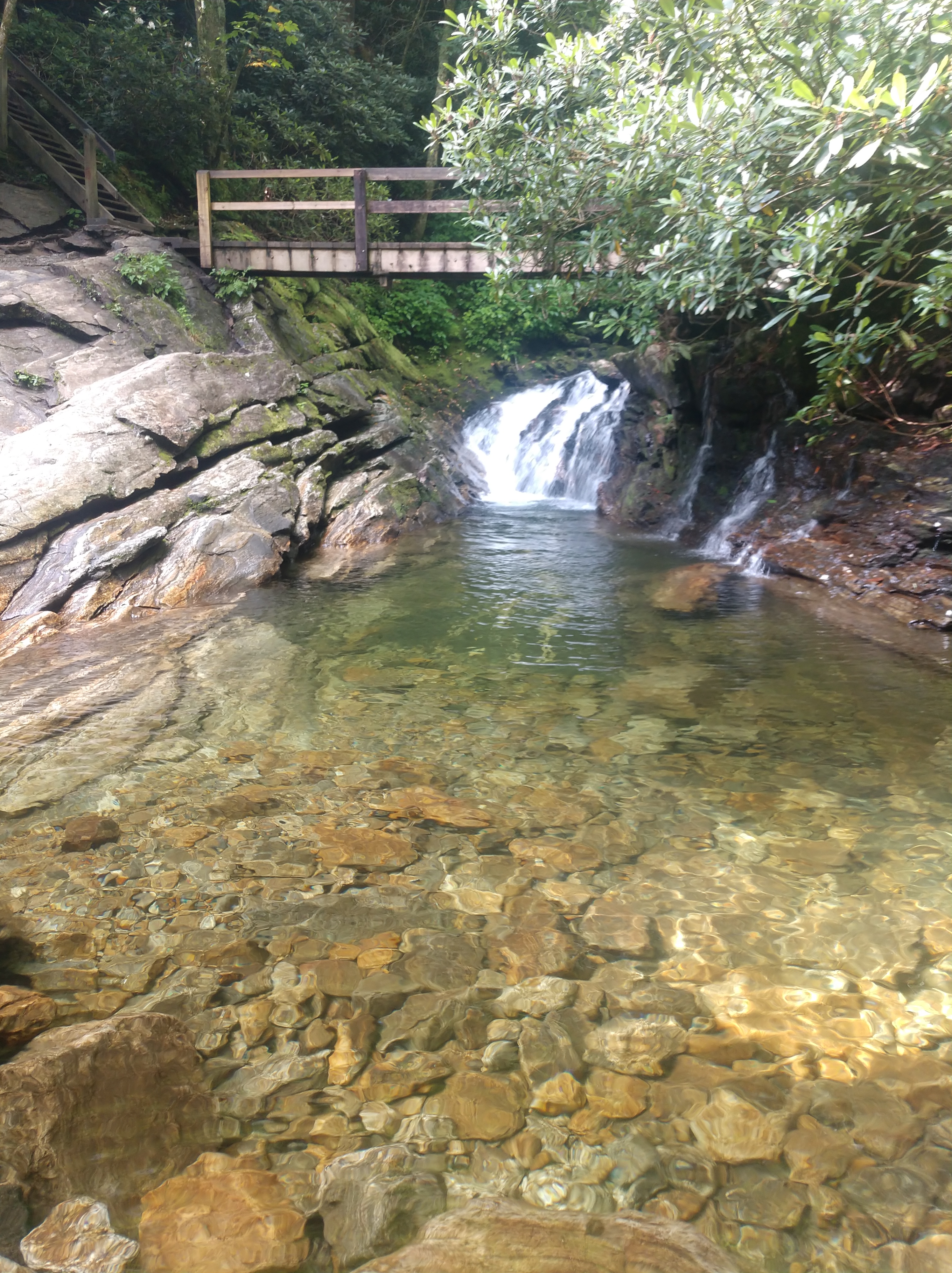 It’s funny that I had that conversation about blog traffic two days before a morning hike to Skinny Dip Falls. This was maybe my third or fourth time there. Skinny Dip Falls is a gorgeous waterfall and series of swimming holes about 45 minutes south of Asheville on the Blue Ridge Parkway. It’s easily accessible. The hike is just one-mile roundtrip, and a series of wooden staircases and bridges make navigating very easy. Its accessibility often makes Skinny Dip Falls very crowded. I typically avoid it on weekends and nice weekdays.