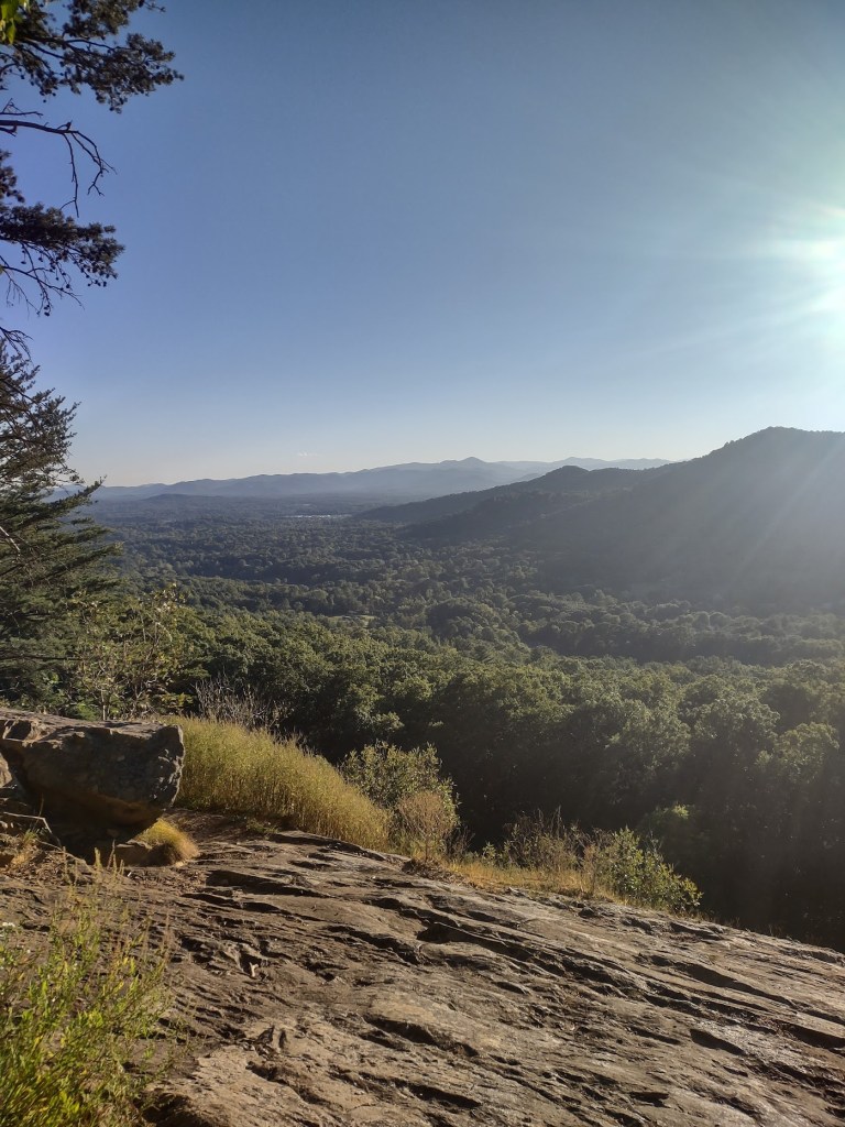 Luckily, there’s always reality to check our assholery, which happened recently when a friend asked me to take a hike on a Tuesday night after we both worked. Not wanting to drive far, and with the daylight waning, he suggested a section of the Mountains to Sea Trail starting at the Western North Carolina Folk Center and ending at the Haw Creek Overlook. In my mind, I dismissed this as a walk versus a hike because it A) wasn’t very far out of town, B) didn’t look like it would be strenuous, and C) it wasn’t harder, better, faster, stronger, or anything that could remotely be considered “hardcore.” I even vocalized this as we started walking. However, I ended up having a lovely time. Sometimes a walk in the woods is all you need, sometimes (often) a worthwhile hike doesn’t have to tax your body, and stunning views aren’t always necessary when you’re catching up with a friend in nature without the distractions modern life so often limits us with. Plus, the Haw Creek Overlook view, where we decided to chill for a while before turning around, ain’t too shabby.