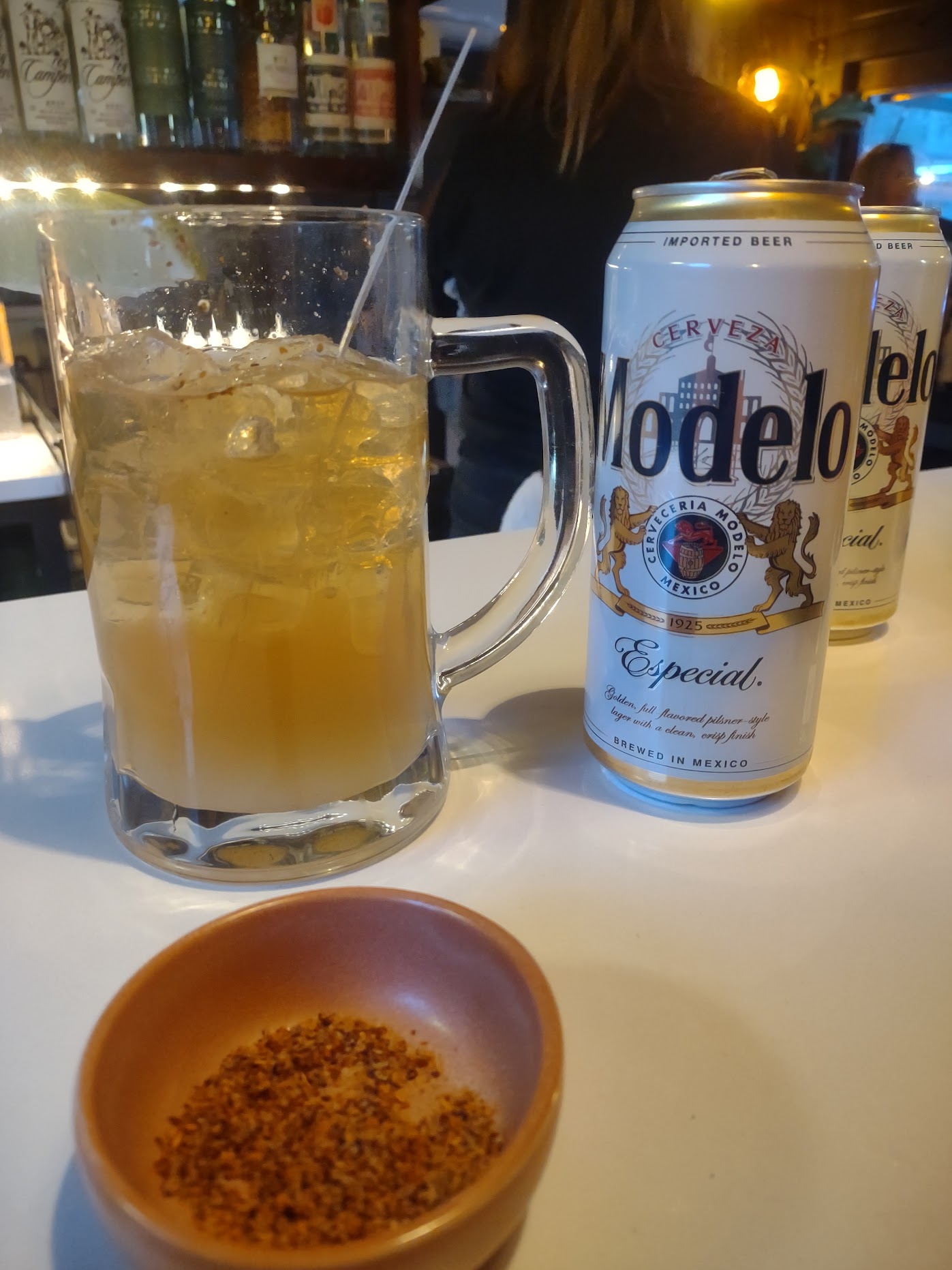 Anoche will be a perfect summertime bar, as it has a nice little side yard full of plants and picnic tables, but also fenced in from the road, which I like. I was there a couple of nights ago, and the right wall bordering the backyard opens garage door style, which really opens the inside up (and I’m a sucker for dining/drinking establishments where one person could sit outside while another sits in…I have no idea why). Anoche also has what I think will become my favorite summertime drink: the Chelada: a Modelo mixed with lime juice (and, traditionally, celery salt, which I hold because I believe the world would be better if celery were eradicated) along with a spiced rim. It’s served in a stein-style mug and is not only delicious but extremely reasonably priced. I think that’s another reason I’ll be hanging at Anoche often. The drinks are very reasonable, which is becoming more and more of a rarity in this world of inflation we currently call home.