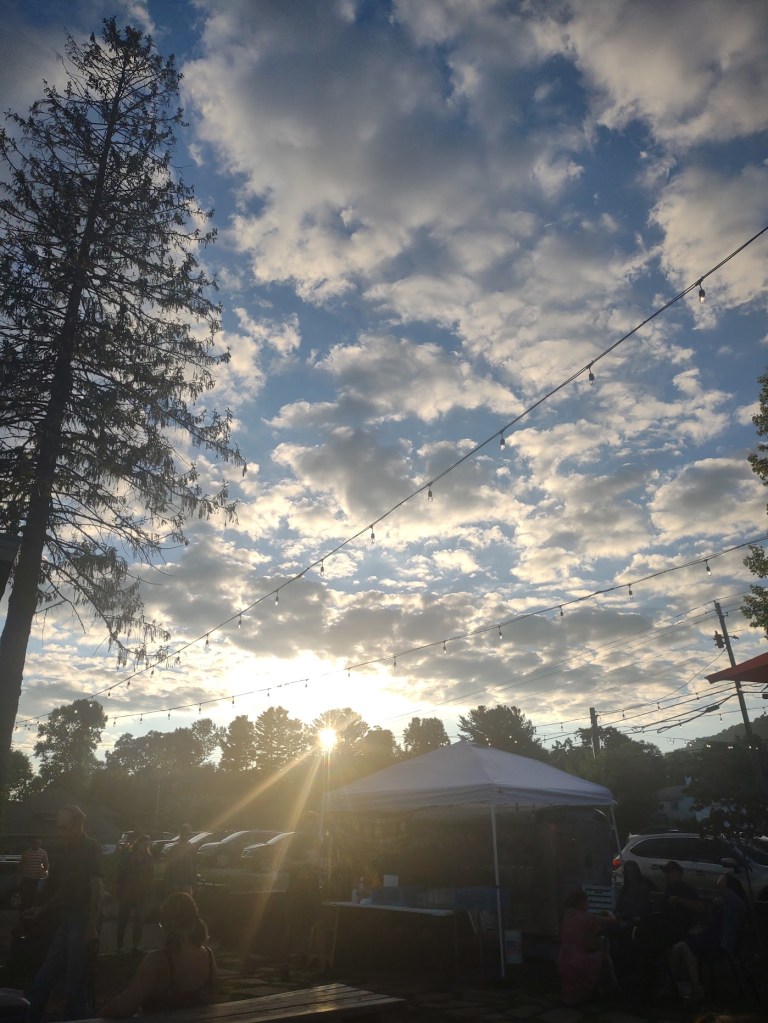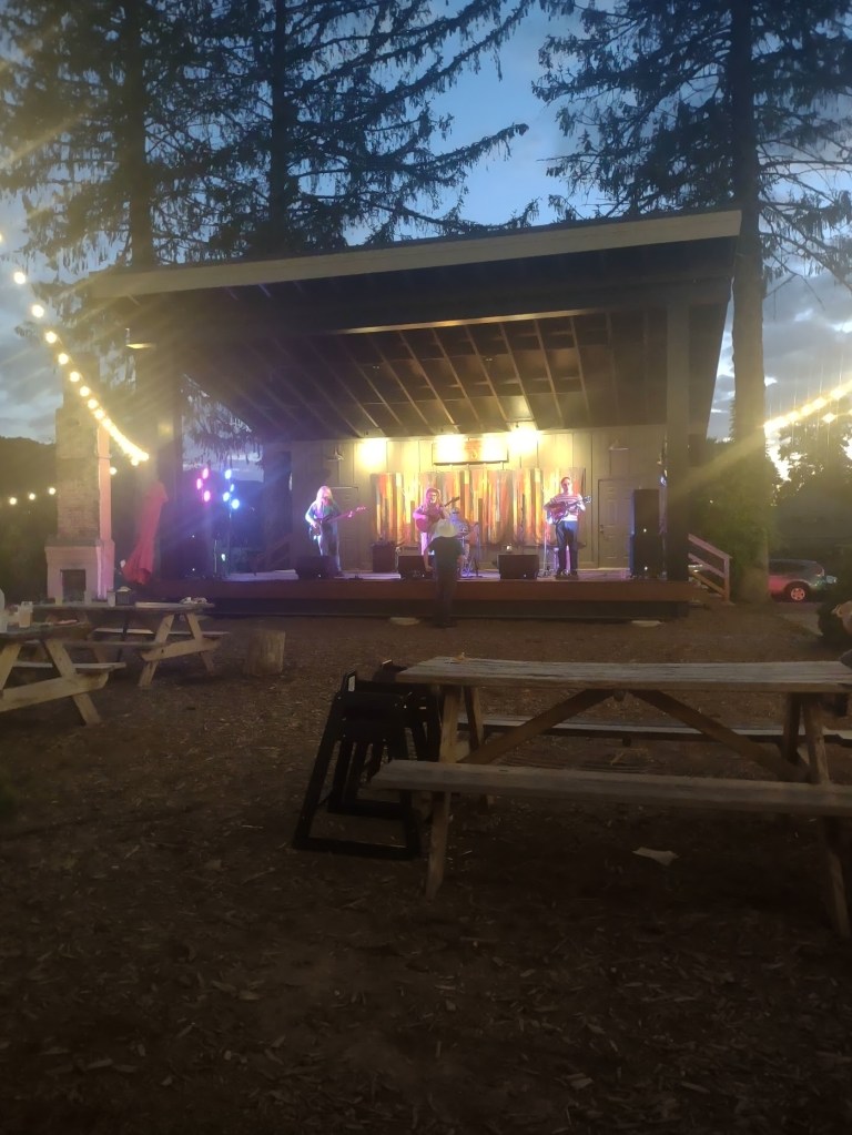 That night, after checking into our AirBnB in the mountains outside Burnsville, we went to Homeplace Brewing, as they advertised outdoor music. They had a solid Bluegrass band, so we settled in with some beers, pizza, and wings and enjoyed a low-key listen as the sun set in the background. It was also pretty perfect: relaxing fun…and though it wasn’t his genre, it was definitely something Buffett would’ve approved of and/or written about. And then either Shawn or I—I can’t remember who—pointed out that we were enjoying a Labor Day Weekend show, the kind memorialized in the opening of “Come Monday.”
