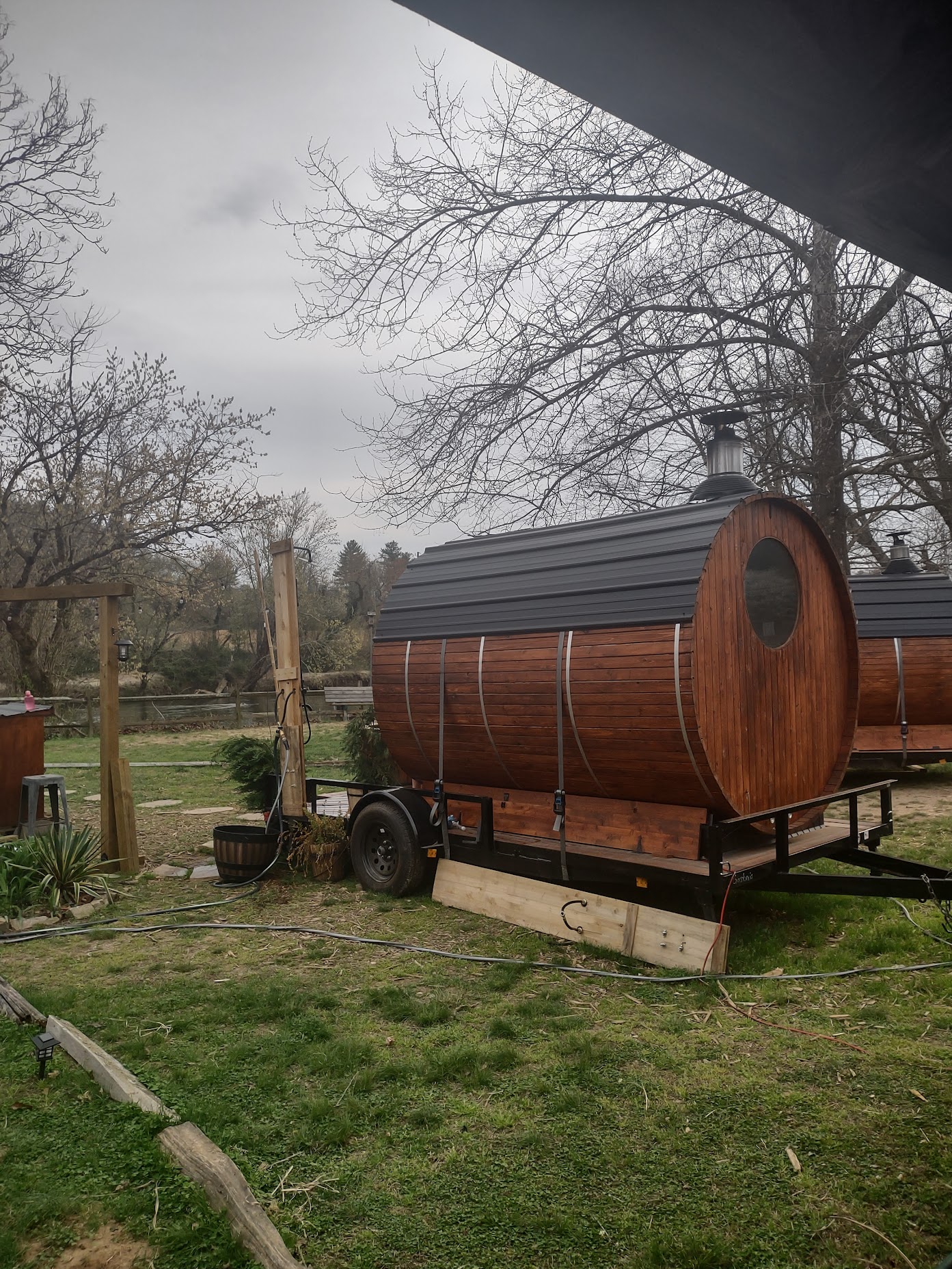 Billed as “Asheville’ first wood-fired sauna & cold plunge experience,” Drip Sauna is a business that has two wood-fired, mobile barrel saunas and corresponding cold plunges that live at the Asheville Adventure Campground just off Amboy Road. They offer private mobile bookings, private riverside sessions, and community riverside sessions, which is what I booked with a friend for a Wednesday night (as of this writing, community sessions—aka public sessions—are only on Tuesdays, Wednesdays and Thursdays in the evening).