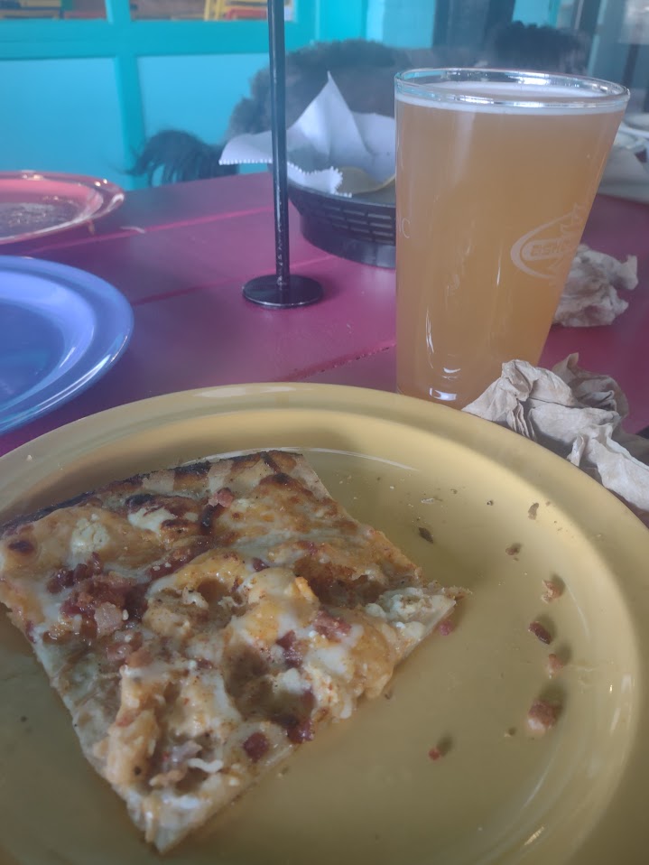 I ended up at Asheville Brewing with some friends recently and tried one of their pizzas (on my first visit, I had the boneless wings, which were excellent), specifically, the Hot Sexy Mother Clucker, which, per their website, has a “ honey base, hot & spicy fried chicken, pimento cheese, goat cheese, sliced red onion & crumbled bacon.” I got it with no sliced red onion because, aside from tomatoes, I like my pizzas primarily made of meat and dairy.