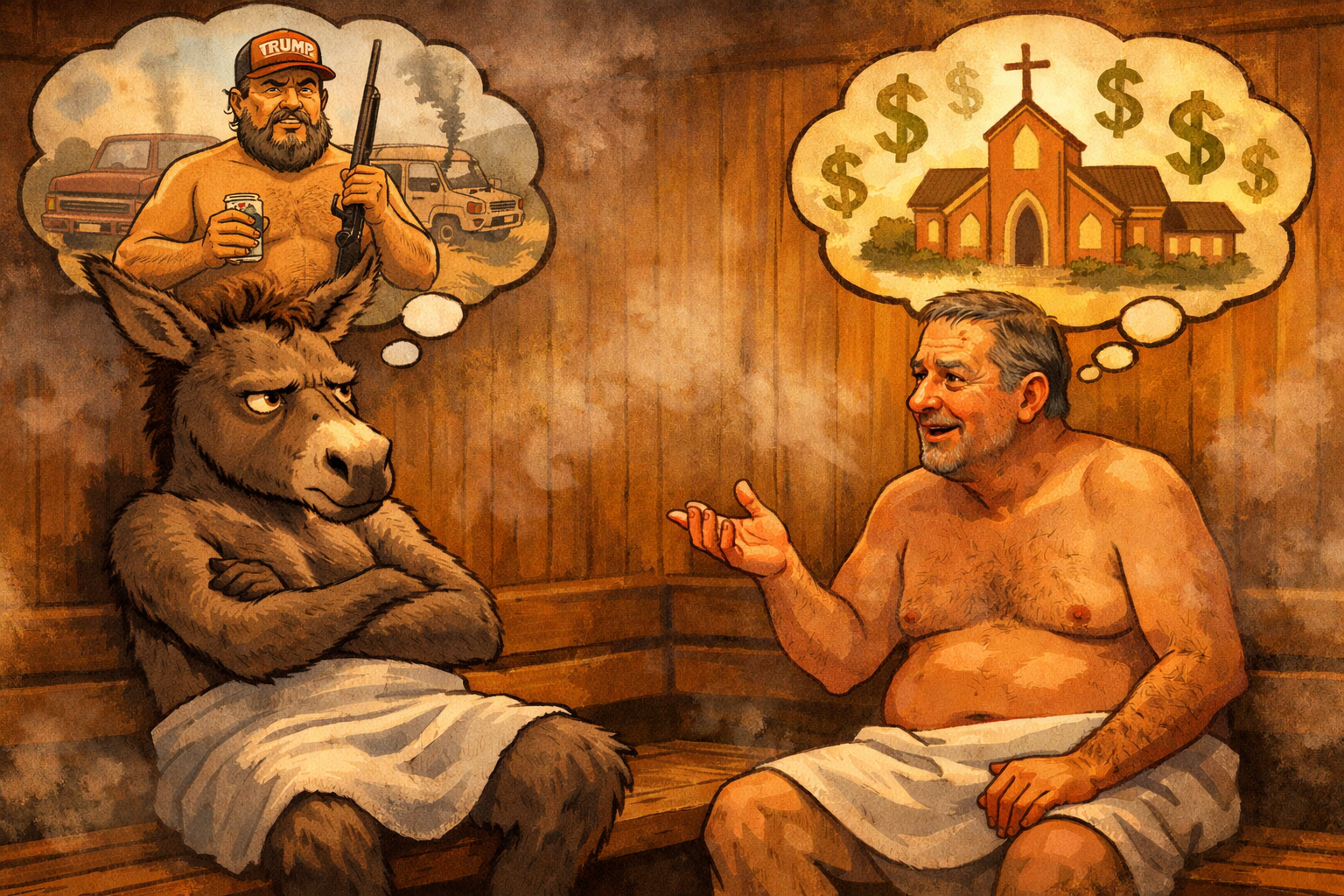 The conversation was flowing, and I can’t recall exactly how it emerged, but religion came up. As soon as it did, I started steeling myself up for an uncomfortable conversation. I assumed—and we all know what happens when you do this—he’d start telling me the merits of the Baptist church or encourage me to check out his home congregation (and to give myself some credit, these are both things that have happened to me in the Gold’s Gym sauna), but instead, he said, “Doesn’t it piss you off how rich the pastor at the chuch next door is?” (there is a large megachurch in the same plaza as the gym), and we ended up having a super interesting, very insightful conversation about when we each first started questioning the religions we grew up in, and when we started realizing how many people mask greed with piety.